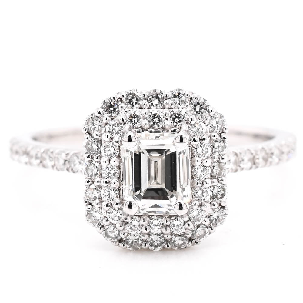 14KT White Gold 1.07CTW Emerald Cut Canadian Diamond Double Halo Engagement Ring.