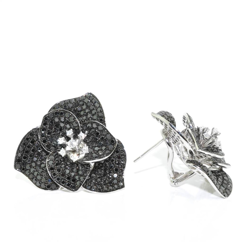 18KT White Gold 5.66ctw Black & White Diamond Flower Earrings.