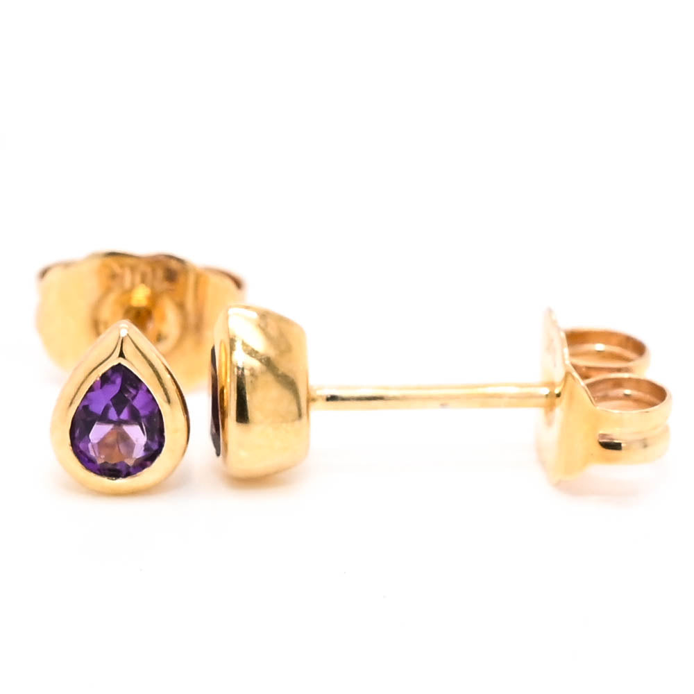 10KT Yellow Gold 0.35CTW Pear Shape Amethyst Bezel Set Stud Earrings.