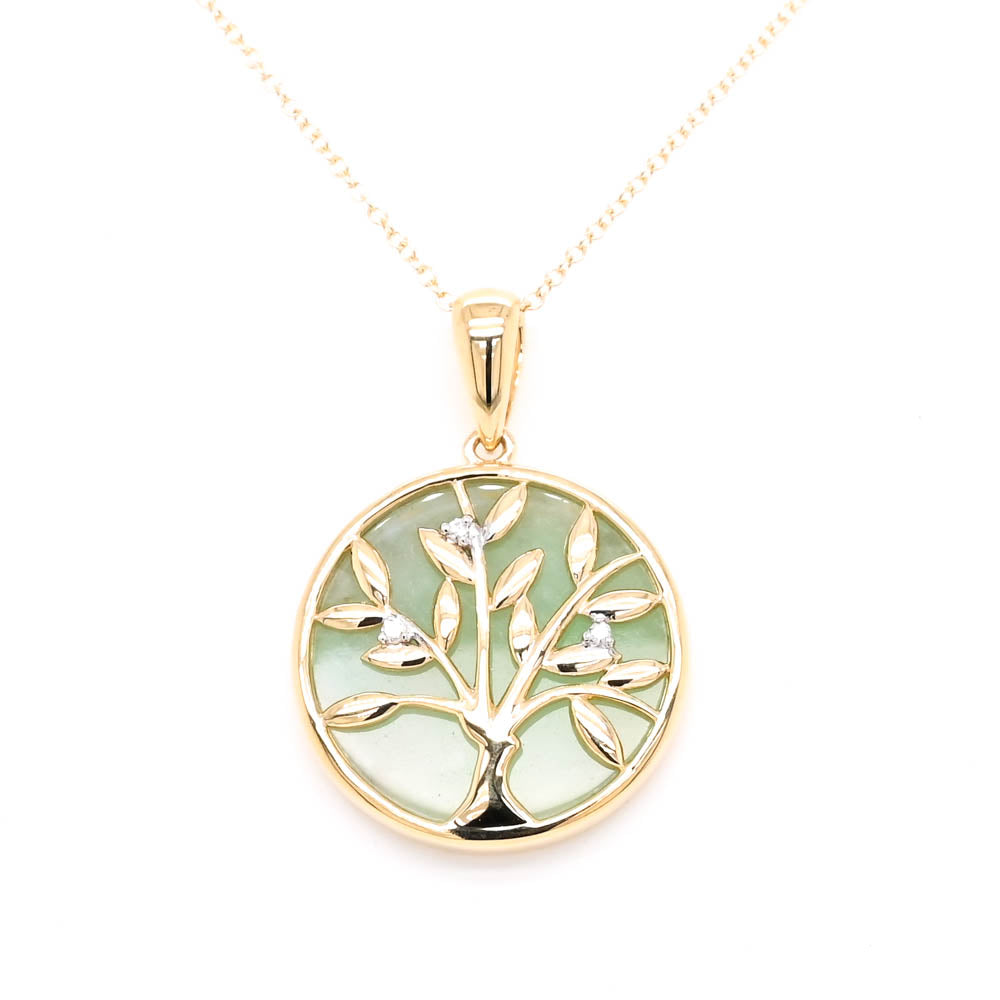 10KT Yellow Gold 18" Jade & Diamond Tree of Life Necklace.