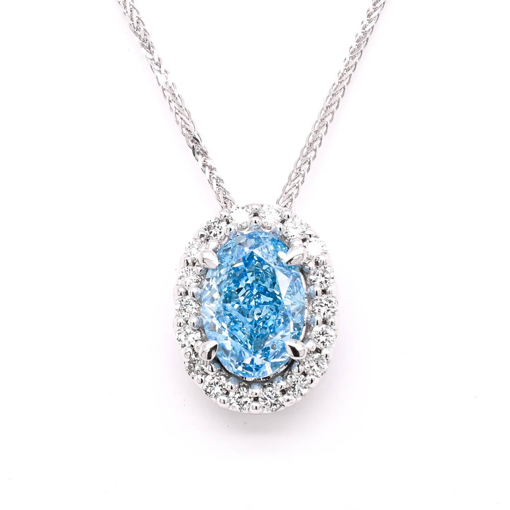 10KT White Gold 18" 2.30CTW Oval Shape LAB Created Fancy Blue Diamond Halo Set Necklace.