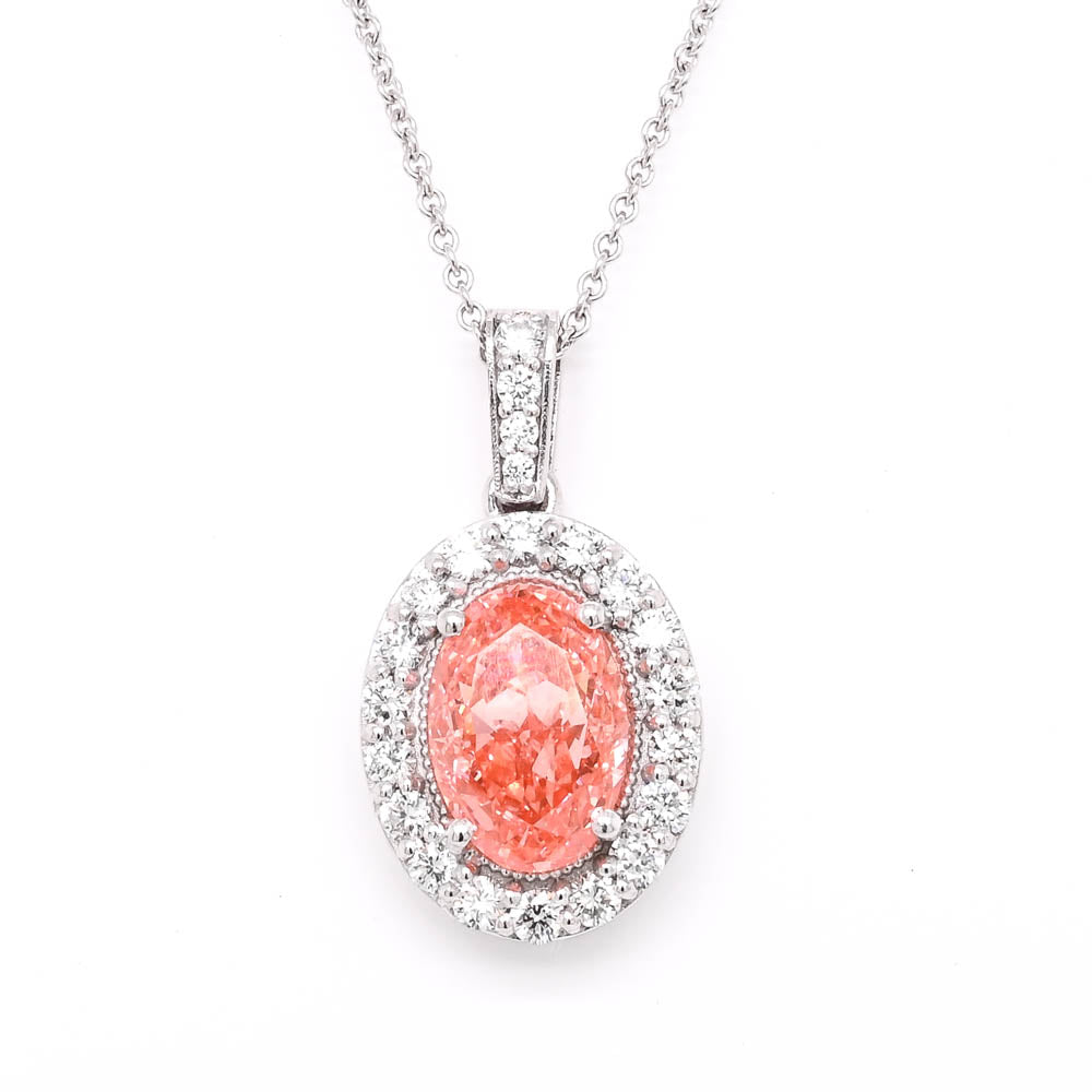14KT White 18" 4.02CTW Oval Shape LAB Created Fancy Pink Diamond Halo Set Necklace.