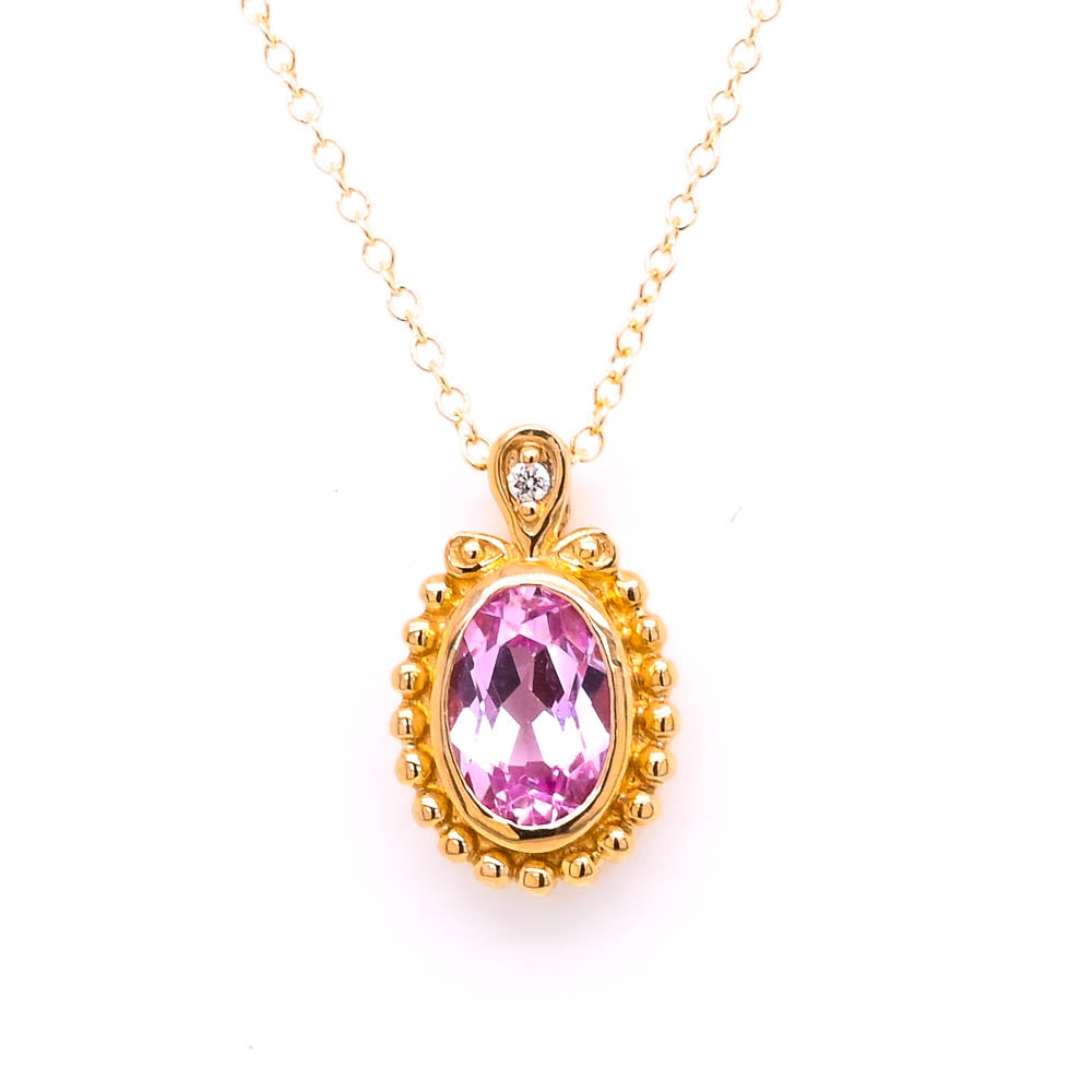 10KT Yellow Gold 18"0.65CTW Created Pink Sapphire & Diamond Necklace.