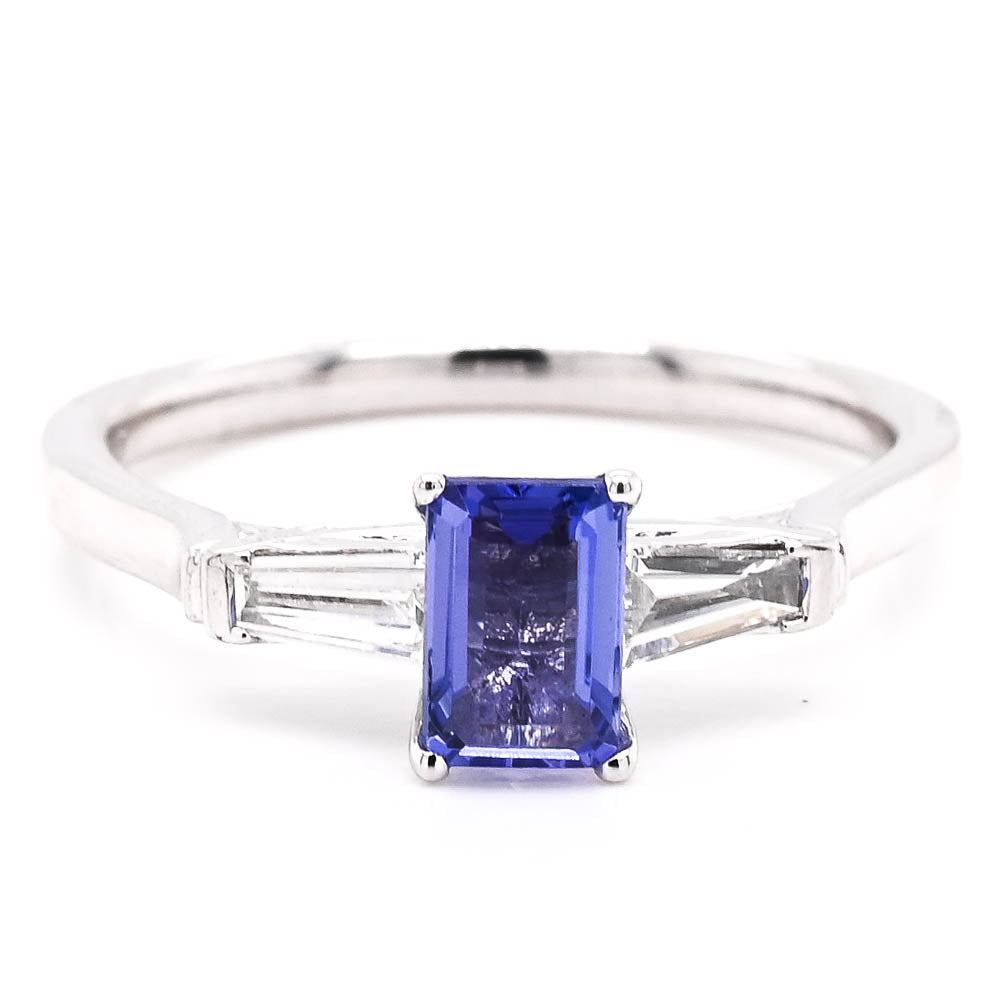18KT White Gold 0.55CT Emerald Shape Tanzanite and Diamond Ring.