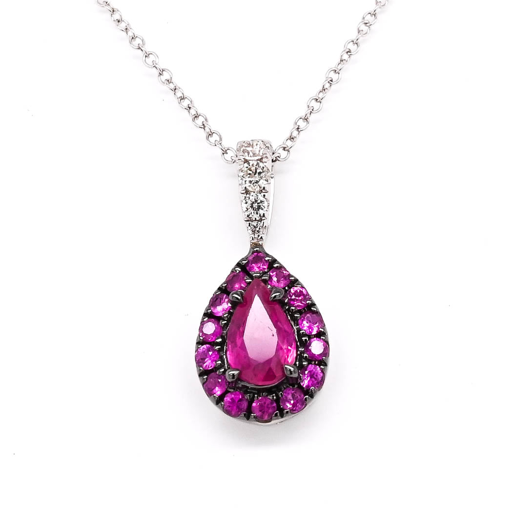 10KT White Gold 18" 0.52CTW Pear Shape Ruby Halo Set Necklace.