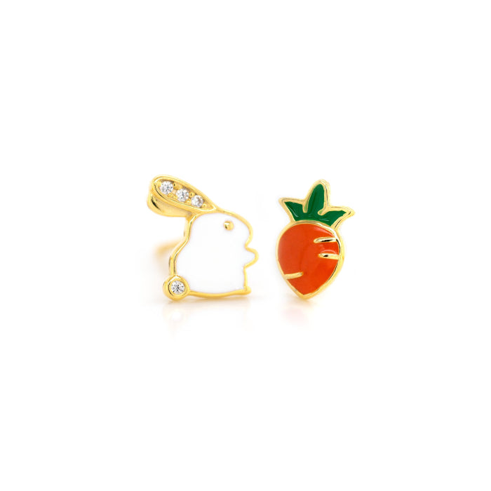 Sterling Silver Gold Vermeil CZ Mismatch Enamel Easter Bunny & Carrot Stud Earrings.
