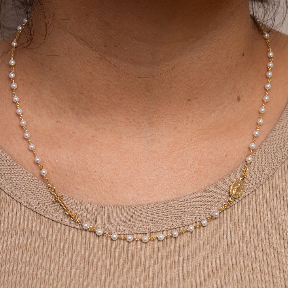 Sterling Silver Gold Vermeil 20" Rosary Religious Pearl Beaded Necklace.