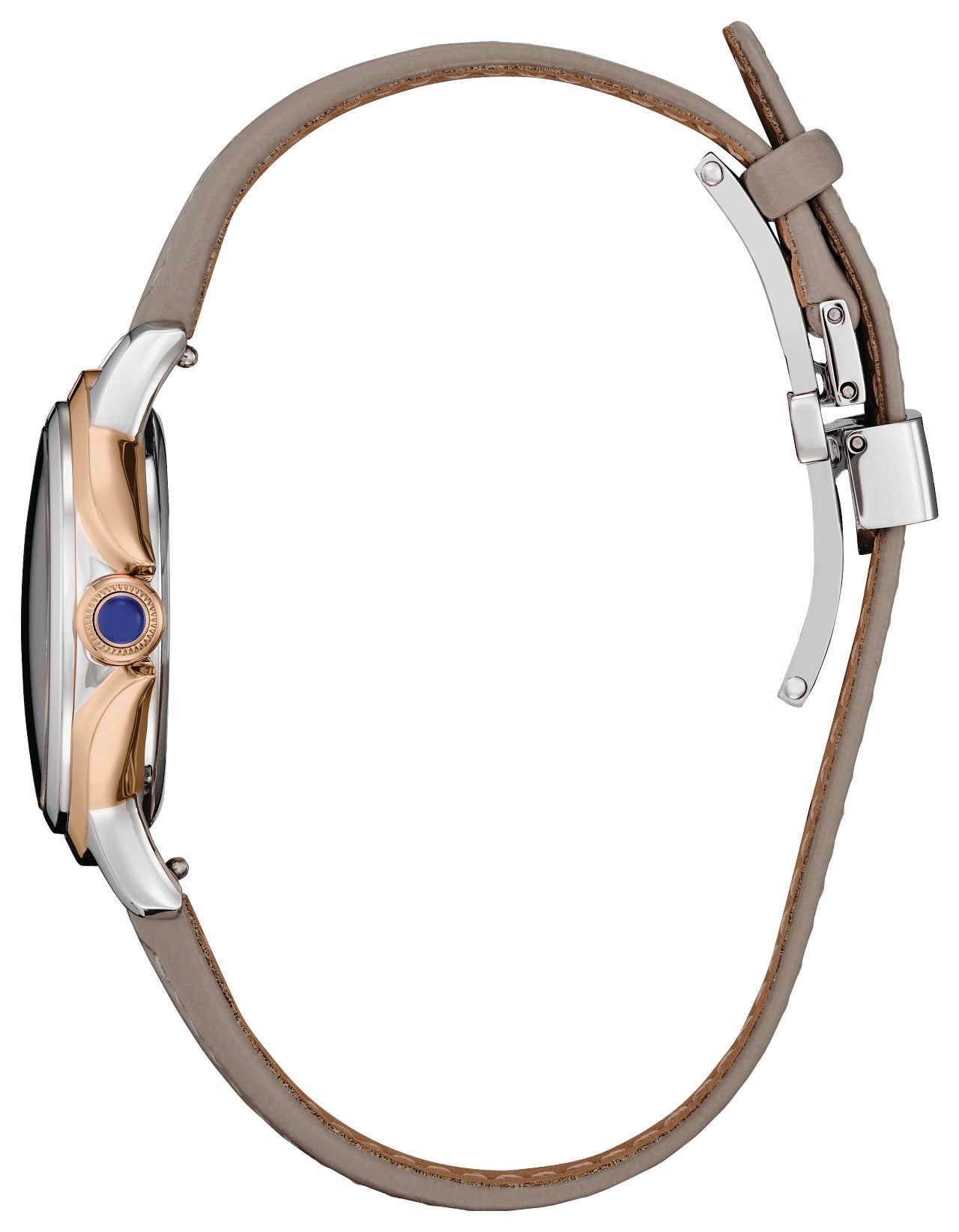 Special Feature: Synthetic Blue Sapphire Crown (The winding crown is set with a brilliant blue synthetic sapphire cabochon, providing a luxurious pop of color that contrasts beautifully against the rose gold and taupe palette)