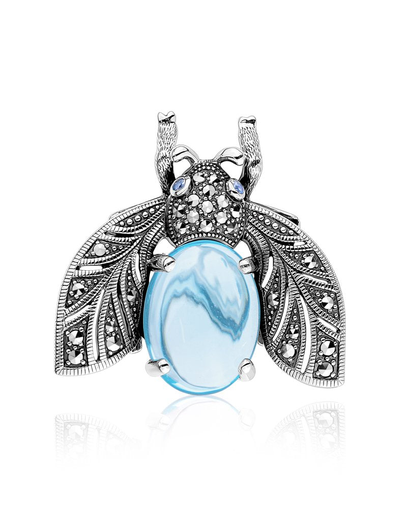 Larus Sterling Silver Marcasite & Cabachon Blue Topaz Beetle Brooch.