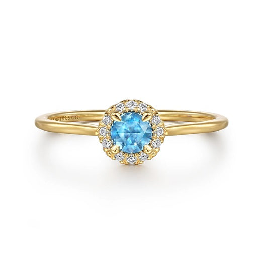 Gabriel & Co 14KT Rose Gold 0.28CT Blue Topaz & Diamond Halo Set Ring.