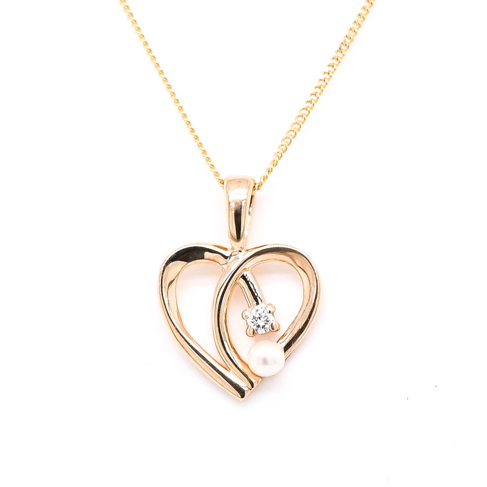 Fire & Ice 10KT Yellow Gold 18" 2.5mm Pearl & Canadian Diamond Heart Necklace.