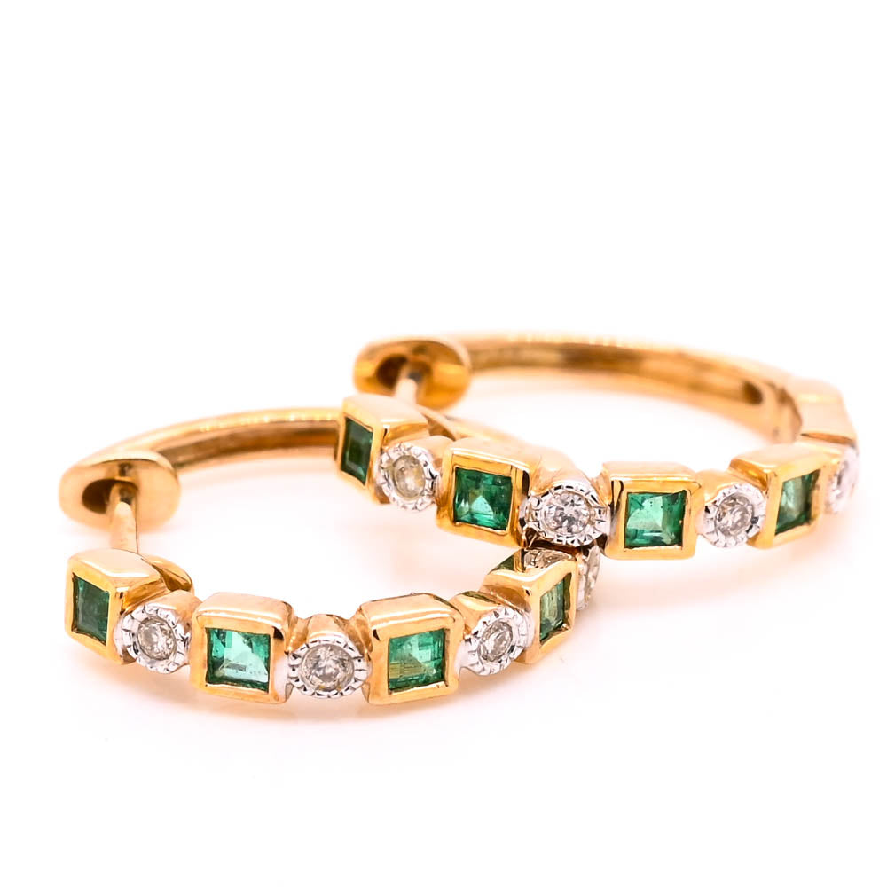 10KT Yellow Gold 14mm 0.15CTW Emerald & Diamond Huggies Earrings.