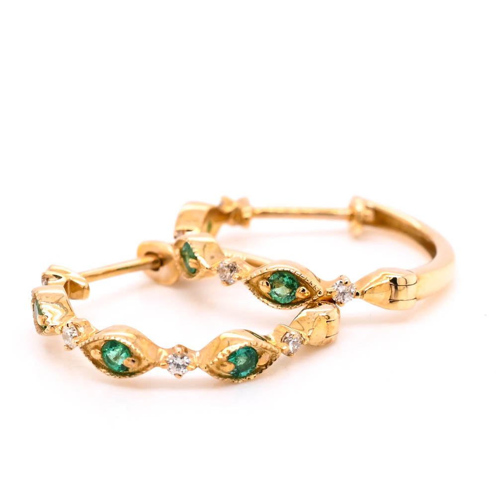 10KT Yellow Gold 14mm 0.20CTW Emerald & Diamond Huggies Earrings.