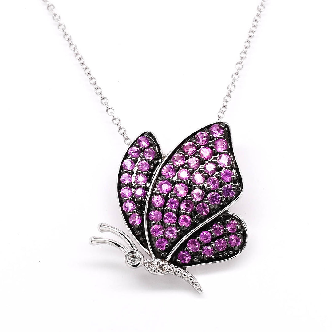 10KT White Gold 18" 0.45CTW Pink Sapphire and Diamond Butterfly Necklace.