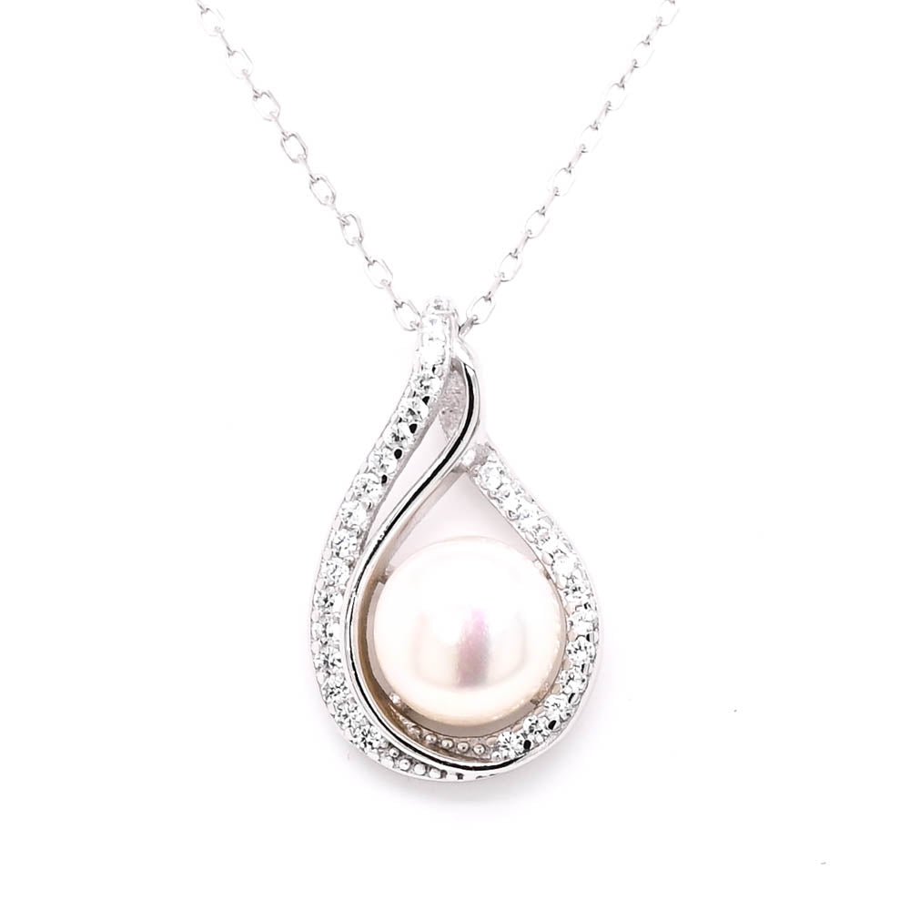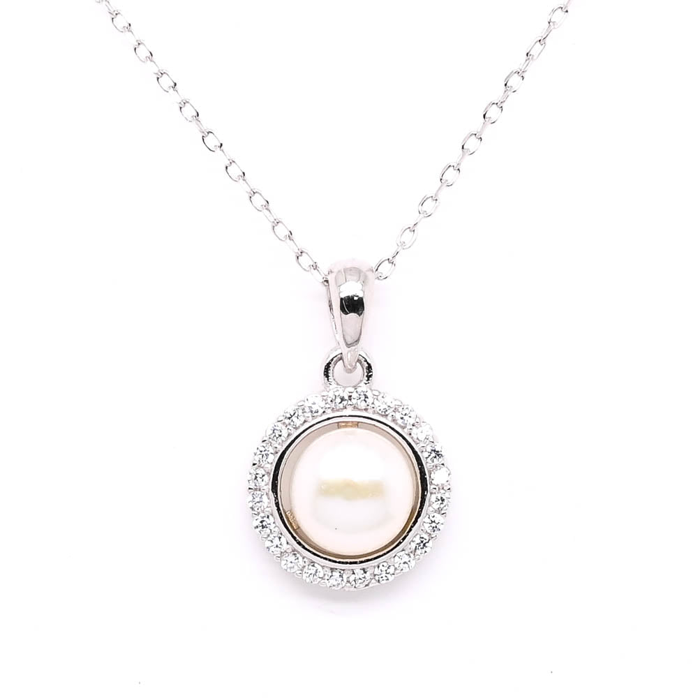 Sterling Silver 18" C.Z Freshwater Pearl Halo Set Necklace