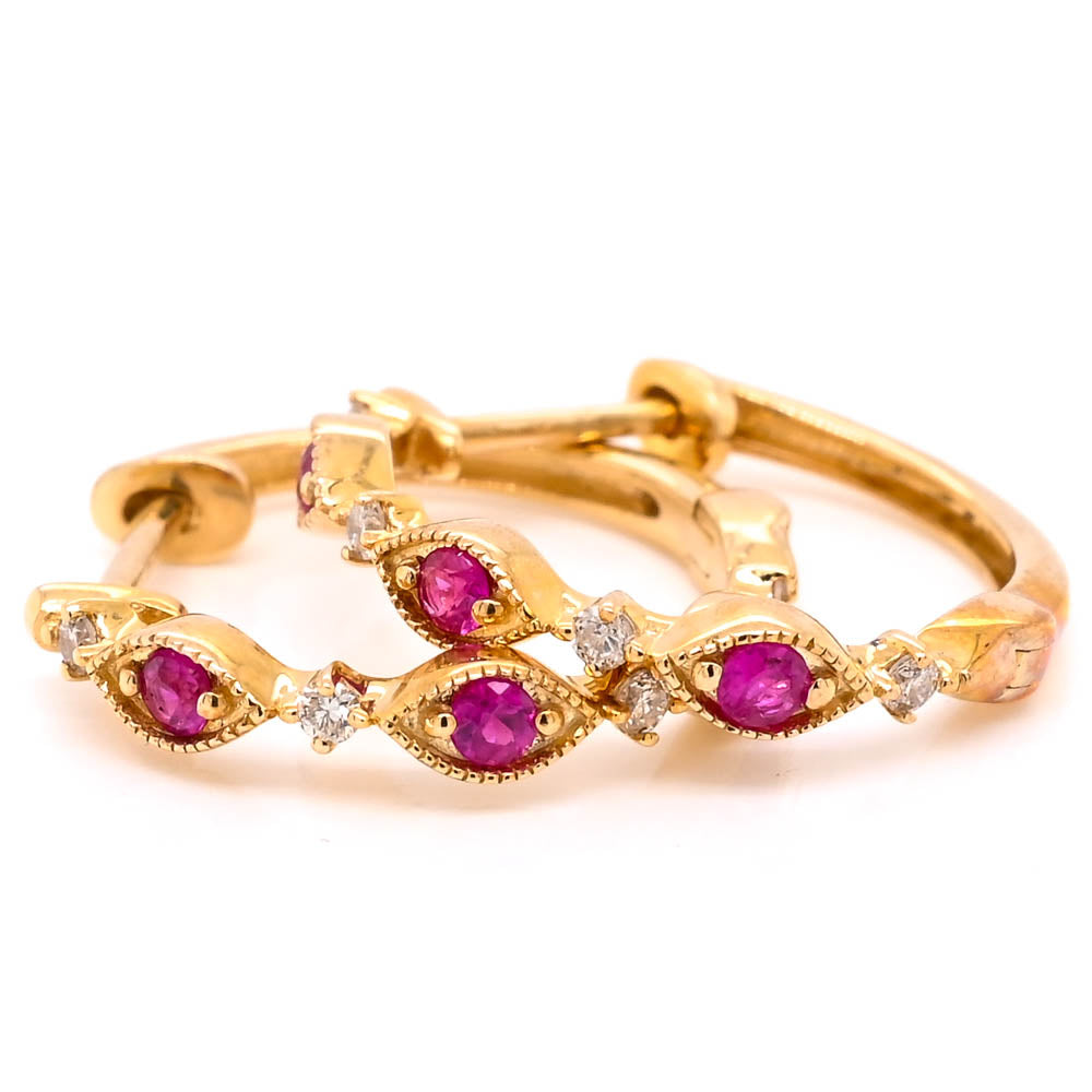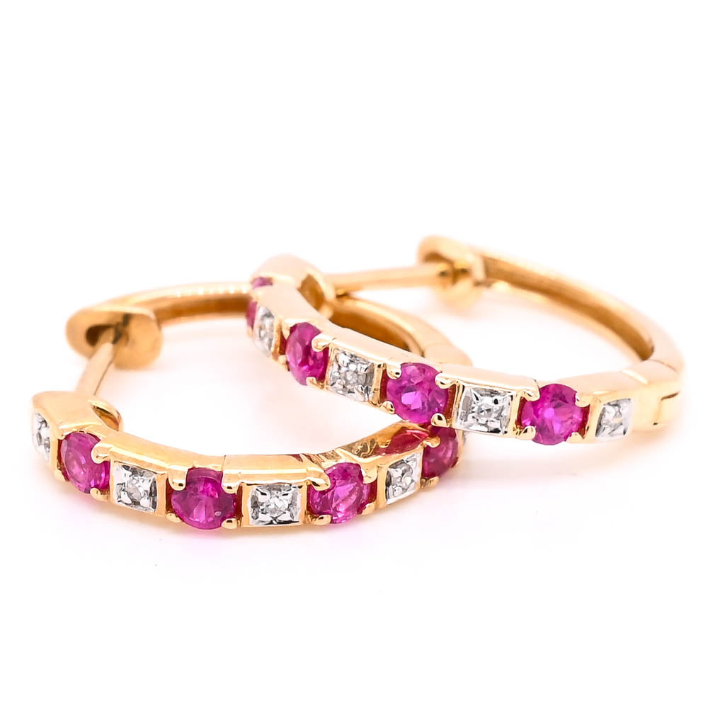 10KT Yellow Gold 14mm 0.24CTW Ruby & Diamond Huggies Earrings.