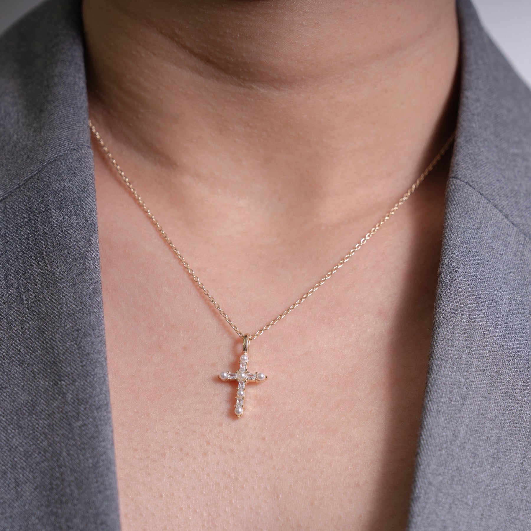 An elegant sterling silver necklace adorned with a delicate cross and a luminous freshwater pearl accent, offering timeless beauty with a graceful, modern touch.